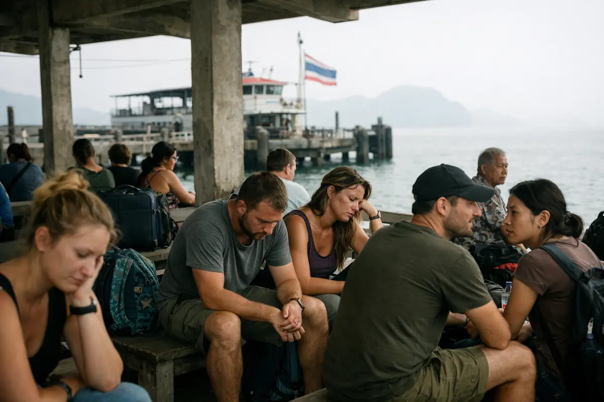 Thailand travel days showing travellers waiting with luggage at a ferry pier during an island transfer